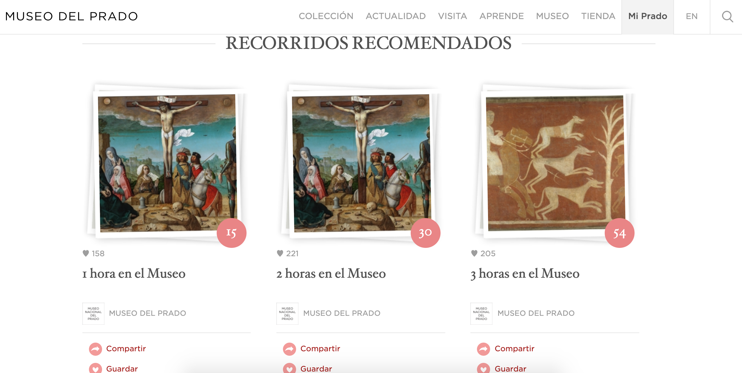 El Museo del Prado posee la más amplia y valiosa colección de pintura española existente hoy en el mundo, desde el Románico hasta el siglo XIX. Cuenta con nada menos que cerca de 4.900 cuadros. Desde la sección Mi Prado, puedes seleccionar tus obras favoritas y realizar un recorrido personalizado, que además luego puedes compartir en tus redes sociales. También hay recorridos recomendados por el museo, de una, dos o tres horas; y recorridos tematizados y maridados con música especialmente seleccionada para cada uno de ellos.